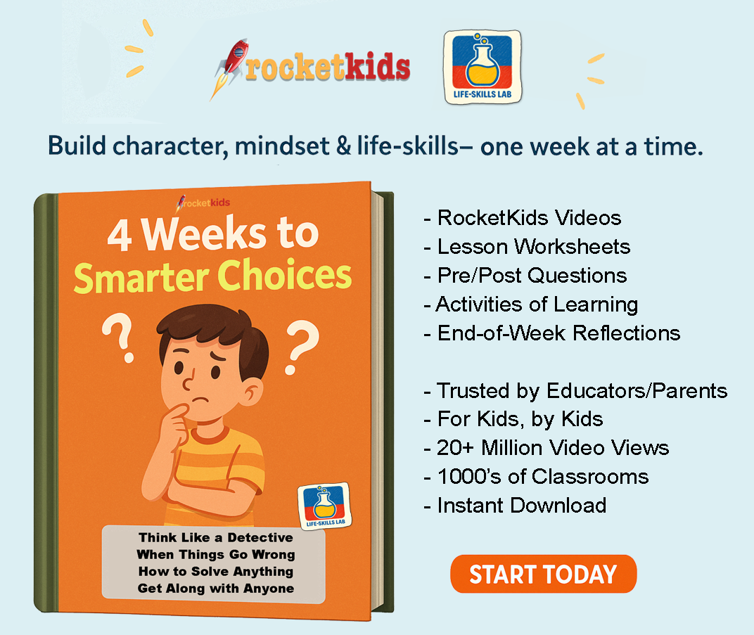 With 20+ million views and used in thousands of classrooms, around the world, RocketKids is now available in compact, easy-to-follow, and relevant 4-week courses. The Life-Skills Lab helps kids build character, mindset, and life-skills —one powerful lesson at a time.
